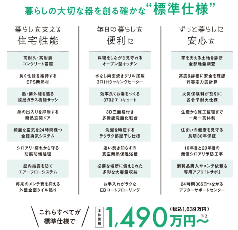 耐震等級3・全館換気・断熱性能などが標準装備され、コスパ重視でも安心できる構造。