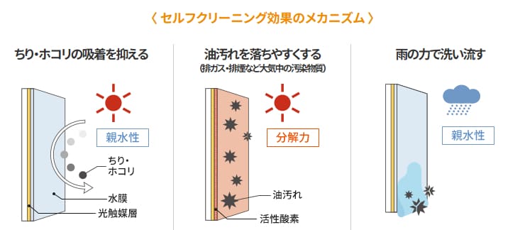 汚れ落ち効果 | 紫外線と雨で効果持続 | 表面に汚れが蓄積すると効果が低下する |