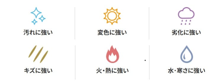 メンテナンス頻度 | 塗装不要・シーリング30年で交換目安 | サイディング系は10〜15年で再塗装必要 |