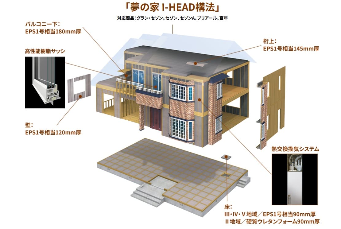 一条工務店独自のI-HEAD構法は、外壁はもちろん天井や床まで、家全体を高性能断熱材(EPS1号相当)で包み込むことで優れた断熱性を発揮。まるで魔法瓶のような高断熱な住まいになります。