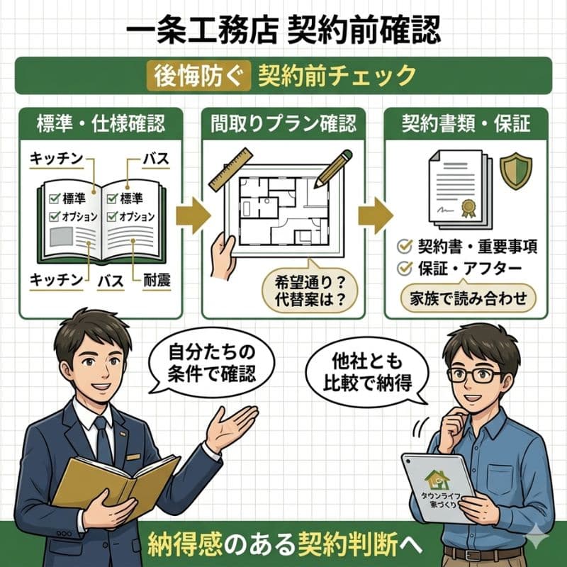 一条工務店で後悔を防ぐには、評判を読むだけでなく、契約前に確認すべき項目を具体的に潰しておくことが大切です。