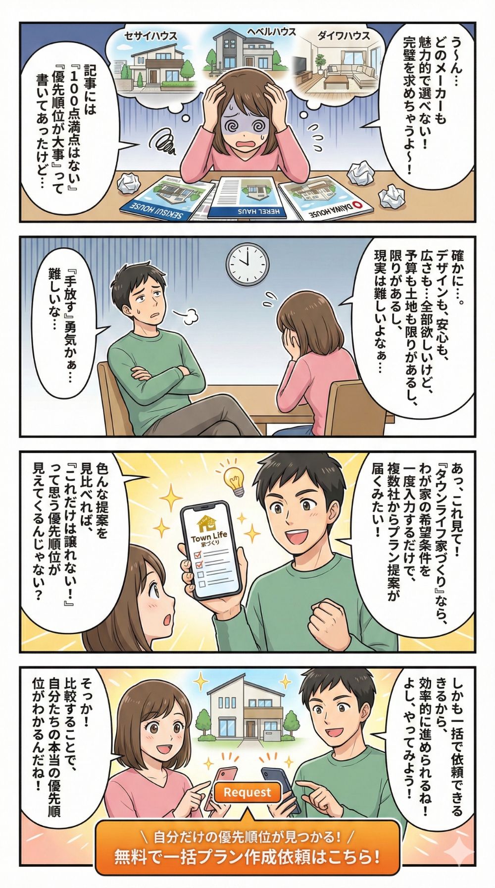 どのメーカーも魅力的でなかなか選べないというのは、裏を返せば「すべての良さを求めている状態」だと言えます。しかし、予算にも土地にも限りがある以上、100点満点の家づくりというのは現実には存在しません。